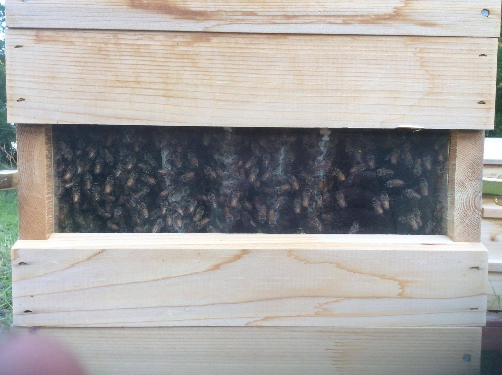 The bee hive is doing exceptionally well considering the rough start, they have already filled the first box and most of the second one with comb, so we added too much over the weekend. They way they are going kind of has be at a quandary, I know you should not pull honey off the first year, but if they keep up this pace I may have to. They main nectar flow from the beans, beets and sunflowers have not even started yet this is what they have done off the initial spring bloom. Here is a picture of what their second box looks like (we have a removable panel):